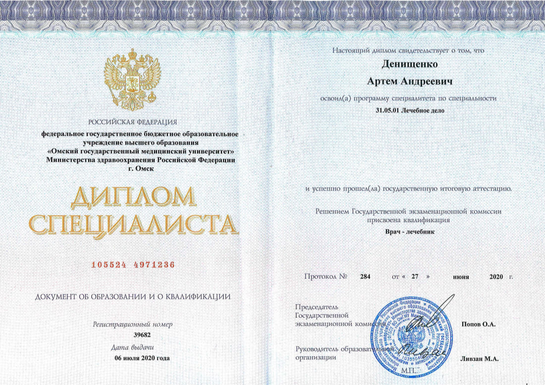 В 2012 году окончил Омский государственный медицинский университет по специальности «Лечебное дело»;