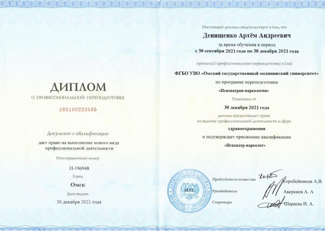 Денищенко Артём Андреевич – опытный психиатр-нарколог с 10-летним стажем работы, кандидат медицинских наук. С 2020 года работает в наркологической клинике «Евро-Клиник», где активно внедряет современные методы диагностики, лечения и реабилитации зависимых пациентов. Его научные достижения, клинический опыт и внимательное отношение к пациентам делают его признанным специалистом в области психиатрии и наркологии.