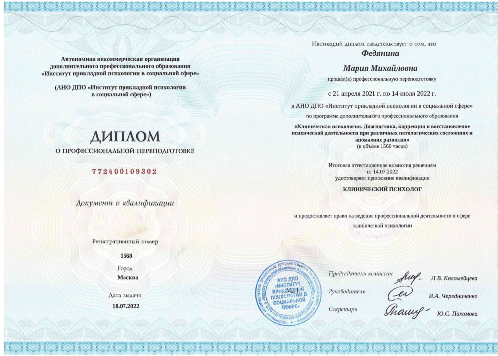 успешно прошла аттестацию и получила квалификацию «Психолог первой категории»;
