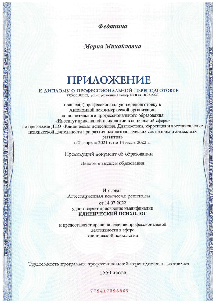 В 2022 году завершила обучение в Санкт-Петербургском межотраслевом институте повышения квалификации по теме «Современные психотерапевтические методы в клинической психологии».